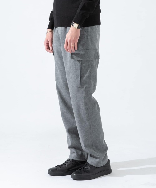 【人気のスタイリッシュ大人カーゴが冬仕様に!】 ウール混のしなやかな風合いを備えた質感・履き心地共に本格派なカーゴパンツは、 裾にかけてテーパードシルエットと控えめなポケットの主張はスタイリッシュかつ、男らしさのあるミリタリーディテールのグッドバランスな大人の一本に。 サイドポケットは高めの位置に配置することで、さりげない脚長効果も。 長めのレングス設定で、裾にたまりを作るのも良し・ロールアップしてすっきりとしたスタイリングも◎ 暖かく、軽快な履き心地を楽しめ、男らしく使い勝手のよいチャコール・グレー・カーキの3カラーでラインナップ。 5ポケットパンツやスラックスとはまた違った表情をみせ、綺麗めなスタイリングに合う大人デザインに仕上げています。 いまからの本格的なウインターシーズンに活躍できる一本です。 -POINT- ・高めのポケット位置による脚長効果 ・しなやかで柔らかなウールフランネル ・ミリタリーディテールのグッドバランス ・スタイリッシュかつ、男らしさのある一本 ・冬の定番パンツとして◎ -CORDINATE- ・綺麗めなトップスが相性◎ ・ジャケットやカーディガン、セーターもオススメ ・足元はローファーや革靴でキレイめに ・スニーカーを履くならバランスを見ながらロールアップを ※この商品は、ピリング(着用中の摩擦などにより毛羽が絡み合い出来る、繊維の表面の毛玉)ができやすい素材を使用しています。ピリングができた場合は、引っ張って取ろうとせず、ハサミや毛玉取り器などで、ひとつひとつ取り除いてください。 ※商品画像は、光の当たり具合やパソコンなどの閲覧環境により、実際の色味と異なって見える場合がございます。予めご了承ください。 ※商品の色味の目安は、商品単体の画像をご参照ください。 ▼お気に入り登録のおすすめ▼ お気に入り登録商品は、マイページにて現在の価格情報や在庫状況の確認が可能です。 お買い物リストの管理に是非ご利用下さい。 ----------------------------- 透け感:なし 伸縮性:なし 裏地:あり 光沢:なし ポケット:あり -----------------------------