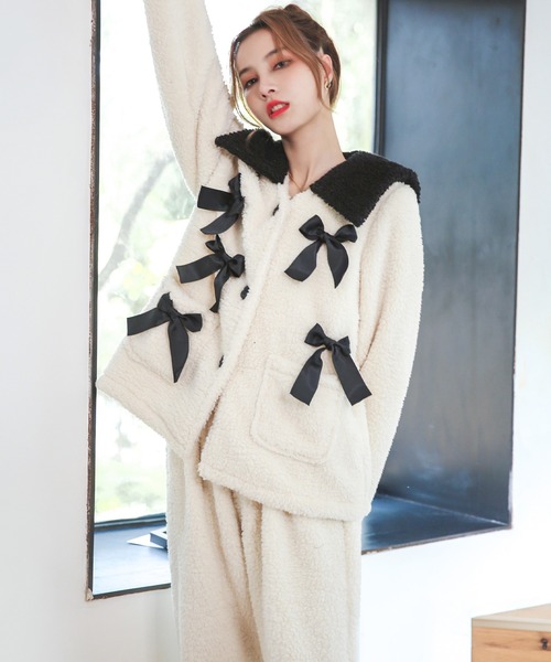 「osyarevo Roomwear colletion」 ≫≫オシャレな新作が続々追加 *Osyarevo`s STYLE * ■ POINT / ポイント バイカラーの大きな襟にインパクトを与えるキュートなリボンが可愛らしいルームウェア。 軽くて暖かいもこもこのシープボアがアニマル感を引き出し、甘さを表現します。 楽に着られるゆったりとしたサイジングなのでインナーにレイヤードがしやすく、真冬の寒い時期でもしっかり着込めて◎ 羽織としても活躍するので、コーディネートを楽しめます。 ボタンがバラのモチーフになっているところがさりげないこだわりポイント。 ふんわり優しい着心地で身も心もリラックスできます。 ■ SET / セット内容 1:カーディガン 2:ボトムス ※上記の2点以外の小物はセットに含まれておりません。 ■ SIZE / サイズ FREE ・サイズは詳細をご確認ください。 ■ MORE INFO / 追加詳細 透け感:なし 伸縮性:ほぼなし ポケット:カーディガンのみあり(両フロント) 前開き(ボタン) 同商品・同サイズにおきましても、納品の時期やロット・染色によって素材感や風合いなどが異なる場合がございます。 また、生産の過程上寸法に誤差(2-5 cm)が生じる場合がございますが、品質やご着用に差し控えないものをお送りいたしております。 ▼商品のお気に入り登録 ハートを押してお気に入り登録をしておくと、再入荷・セール・ラスト1点...etcを通知でお届けします! ▼ブランドのお気に入り登録 新商品やクーポン配布などのお得な情報を受け取ることができます。
