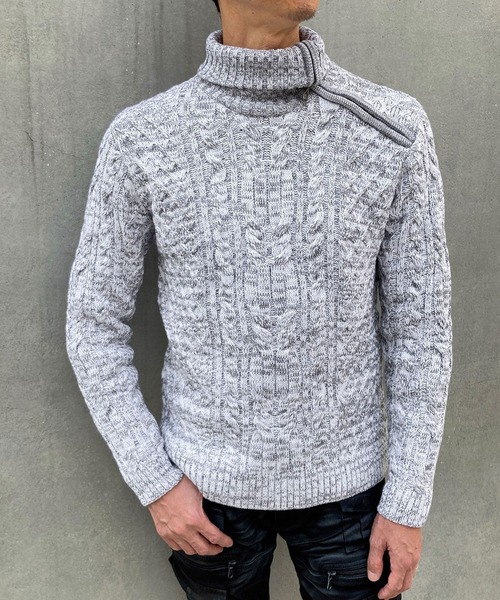 ミドルゲージのバルキー糸を使用した、ケーブル編みプルオーバーニットです。ふっくらとして、かさの高いバルキー糸を使用することによって、立体感のある柄になっています。肩先から衿にかけてのファスナーがデザインポイントです。アクリルポリエステルなのでチクチク感がなく、快適な着心地です。※バルキー糸…合成繊維の熱可塑性を利用してつくるかさ高糸をいい、かさ高紡績糸とかさ高加工フィラメント糸に分類されます。バルキーアクリルは染色時の熱によって縮れる為、中に空気が入り膨らみます。この加工によってかさ高性が増し、より軽く保温性に優れた糸に仕上がります。