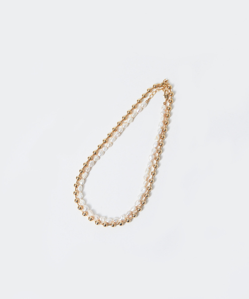 ボールチェーンとバロックパ-ルのコンビネックレス。 ボールチェーンの先のカンの留め位置で色々なアレンジが可能。 其々1本づつでも使用可能な、スタイリングに合わせて使える嬉しいアイテムです。