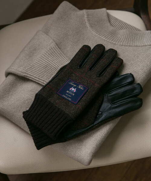 甲部分には英国老舗ファブリックメーカー"MOON(ムーン)"社のツイード素材、手のひら部分にゴートレザーを用いた切り替えのグローブ。