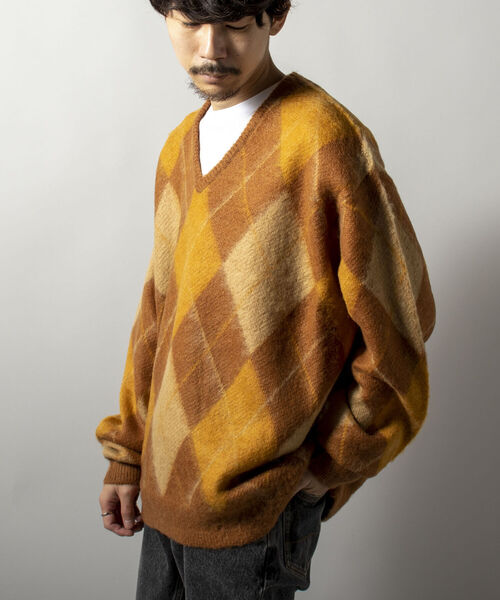 #GY-D0008VER大胆に入ったアーガイル柄をジャガードで表現したVネックのプルオーバーニット。バストやアームホールにゆとりを持たせながらも着丈は短く設定している為、すっきりとしたバランスが特徴です。光沢感とぬめりが特徴のモヘアをブレンドした素材を使用。仕上げに縮絨+起毛加工している為、モヘアの毛足の長さを最大限引き出した商品です。編み組織もダブルJQでアーガイル柄を表現している為、裏側に糸渡りがないのですっきりと着用して頂けます。また、リンキング部分に静電気防止糸を使用している為、着用、着脱時の静電気を軽減します。【スタッフ着用コメント】身長:170cm/体重:52kg/体型:細身/普段サイズ:M/着用サイズ:L柄ニットですが落ち着いた色味なので着回しもしやすいです。インナーはカットソーからシャツまで対応。一枚で主役級のモヘアニットです◎【GYMPHLEX/ジムフレックス】イギリスのレスターシャ州で1936年に創業された体操着メーカー。英国のナショナルラグビーチームのユニフォームや、ETONやHARROWといった名門プレッピースクールの体操着にも採用されています。※お取扱い上のご注意アテンションタグを必ずご確認の上、着用又はお取り扱いください。※店頭及び屋外での撮影画像は、光の当たり具合で色味が違って見える場合があります。※商品画像に関しては出来る限り忠実に表示出来るよう努めておりますが、お客様がご利用のモニターの設定及び特性により、実際の商品と比較し色味に若干の誤差が生じる場合があります。◇商品のお気に入り登録◇【お気に入りに登録】を是非ご活用ください。 再入荷の通知や、ラスト1点の通知、セールの通知がいち早く届きます。◇ブランドのお気に入り登録◇新商品や再入荷など、いち早くブランドのお得情報が届きます。