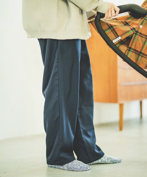 爆発的ヒットを続けているCALIFORNIA シェフパンツシリーズよりスラックス感覚で履けるツータックパンツ型が登場! 他のシェフパンツとは圧倒的に違う生地感とシルエットが特徴です。 生地感はかなり柔らかく、足を動かすたびに揺れるドレープ感がトレンド感のある作りになっています。 さらに、今回はブラック、ブラウン、ネイビー、ブルーの4色の暗めカラーでまとめて使いやすさ満点のカラー展開となっています。 さらにシルエットは太もも辺りにゆとりを持たせ、裾に向かっていくにつれて若干のテーパードをさせており、カラー・素材感も相まってきれいなシルエットに仕上がりました。 別名「コックパンツ」とも呼ばれるワークパンツがルーツですが、それを感じさせなCALIFORNIA シェフパンツを是非ご堪能くださいませ。 ※その他の”シェフパンツシリーズ”もおすすめです! 「品番:21030464603040」「商品名:《予約》CALIFORNIA シェフパンツ」 「品番:21030464602040」「商品名:《予約》CALIFORNIA コーデュロイ シェフパンツ」 ********************** 裏地:なし 伸縮性:なし 光沢感:ややあり 生地の厚さ:普通 ********************** 【スタッフ着用コメント】 《スタッフH》 身長:170cm/体重:60kg/体型:中肉中背/普段サイズ:M/着用サイズ:L サイズ感:ゆったり履くならLでも。 素材感:しっかりとした生地ですが、キレイな見た目。 着心地:足通り良く、軽い履き心地。 ********************** ※店頭・外での撮影画像は、光の当たり具合で色味が違って見える場合があります。 商品の色味は、スタジオ撮影の画像をご参照ください。