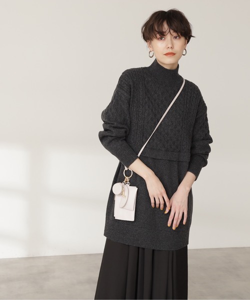 ケーブル編みの短丈ニットをレイヤードしたように見せるデザインニットワンピース。暖かみを感じるウール混なので、冬にぴったりな風合いです。体のラインを拾いすぎない縦ラインを強調するミニ丈のシルエットが、スカートにもパンツにも合わせやすくなっています。ショートパンツ×ロングブーツを履くと新しいバランスでスタイリングを楽しめます。