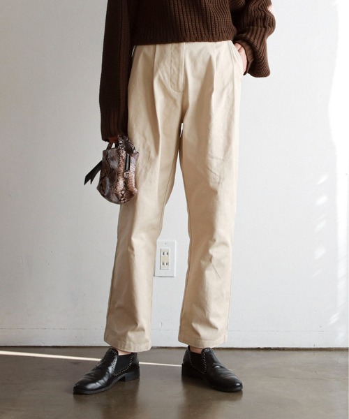 【シーズンレス・シーンレスで使える万能パンツ】 2タック入りの仕様で、ヒップ周りにゆとりが出て履き心地抜群なパンツ。 素材もコットンを使用しているので、シーズンレスでお召し頂けるのはもちろんイージーケア出来る点も嬉しいポイント◎ ウエスト周りもゴムを使用せずフラットなデザインなので、トップスをインしてハイウエストで履いていただくのがオススメ。 ショート丈のトップスなどとも相性抜群です。 お仕事着でもデイリーにもお召し頂ける万能ボトムです。 ----------------------------- 透け感:なし 伸縮性:なし 光沢:なし 裏地:なし ポケット:あり お手入れ方法:手洗い可 ----------------------------- ※照明や天候、閲覧環境によって実際の色味と異なって見える場合がございます。予めご了承ください。 … information … 欲しいitemをお気に入り登録(♡マークをclick) ・お買いのがし対策…完売itemの再入荷やラスト1点の情報をお知らせ ・欲しいitemをお得にget…pricedownになったらいち早くお知らせ ・スムーズ検索…ZOZOのお気に入りアイテムページで簡単checkできるから、再検索不要♪