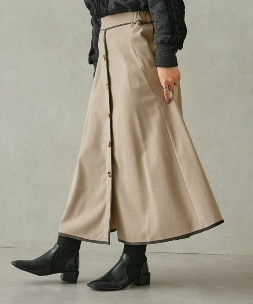 【パイピング・ウールタッチ・ボタンデザイン】細かいデザインも可愛いウールタッチスカート ■point ・パイピングで他のスカートと差が付くアイテムです。 ・落ち着いたカラーは大人カジュアルに相性抜群です。 ・ウエストゴム仕様になっています。 ・丈長なので脚もスッキリとした印象になります。 ・秋冬活躍間違いなしのスカートです。 ■design パイピングが効いているウールタッチスカートです。 ウエストゴム仕様でストレスフリーな履き心地です。 ■fabric 表地ポリエステル80% レーヨン18% ポリウレタン2% 別布 ポリエステル100% -------------------------------------------------- 透け感:なし 伸縮性:なし 生地の厚さ:普通 ポケット:なし 季節:春.秋.冬 -------------------------------------------------- ■coordinate ブラウスやニットなど幅広いアイテムで合していただけます。 ウエストインで合わせてもバランスがキレイにまとまります。 ※商品画像は着調イメージです。 光や角度により、実物と色味が異なる場合がございます。また表示のサイズ感も実物とは若干異なる場合もございますので、ご了承ください。 ※着用、お取り扱いの際は、商品についている品質表示とアテンションタグを必ずご確認ください。 -------------------------------------------------- ♡をクリックでお得な譲歩をお知らせいたします。 <商品お気に入り登録> お気に入りアイテムのお値下げ・再入荷・在庫ラスト1点など通知を受けることができます。 <ブランドお気に入り登録> Chez toiの新商品・再入荷・SALE・クーポン配布などお得な情報を受けることができます。 -------------------------------------------------- リラックススタイル/ストレスフリー/オンオフ/ベーシック/デイリー/大人カジュアル/ママコーデ/ お出かけスタイル/細見え/抜け感/ロングスカート/パイピング/ウエストゴム/パイピングスカート/ウールスカート