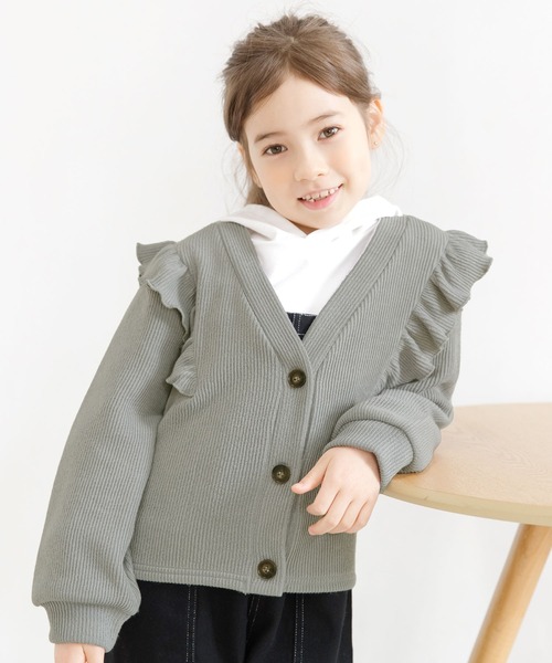 ガーリーな印象の肩フリルがポイントのカーディガン。サッと羽織れる便利アイテム