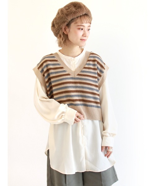 ボーダー編みがポイントのニットベスト。丈感短めのニットベストでスタイルアップしてくれます◎レイヤード次第で春先まで活躍します。暖かみのある印象を与えてくれるベージュベースとシックな雰囲気にぴったりのグレーベースの展開です◎