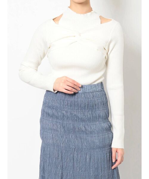 フロントのツイストデザインがカジュアルかつモードな印象のリブニット。 ハイネックで大人っぽく、レイヤード風になっている肩の肌見せがヘルシーな抜け感演出します。 オフショルにすることで、さらに女性らしさを際立たせた着こなしも可能◎ すっきりしたシルエットで着心地のいいリブニットは様々なコーディネートにぴったりです。 ▼スタイリング シンプルなタイトスカートやマーメイドスカートに合わせても映える一枚。 デニムのアイテムやワイドパンツなどカジュアルダウンさせたスタイリングもお勧めです。 アウターの要る時期にも、フロントのデザインがこなれ感をアップさせます。