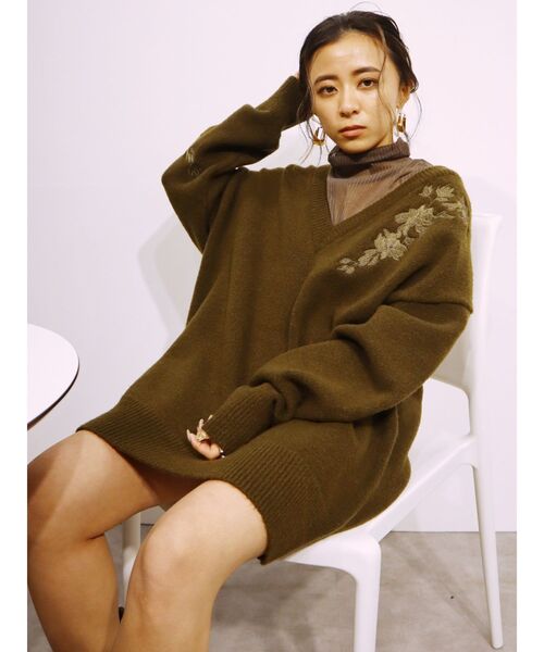 胸部分と右袖に大きくあしらった刺繍がデザインポイントのニットトップス。 もちもちとした質感のニットなので、まだまだ寒い時期に活躍する一枚です。 同系色での刺繍が大人っぽい印象となっており、トレンドのレイヤードスタイルを楽しめる一枚です。
