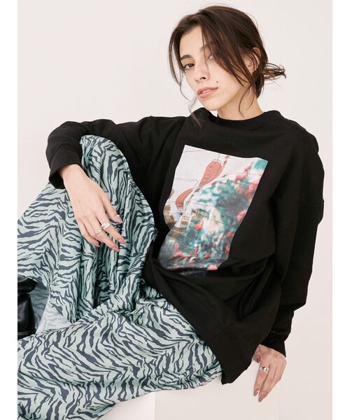 今季トレンドのチャイナモチーフの遊び心あるフォトプリントスウェットトップスです。 ルーズなシルエットでどんなボトムにも合わせやすい一枚です。 今期はボリュームボトムとのスタイリングがおすすめ。 ぱきっとしたカラー展開もEVRIS(エヴリス)らしいスウェットです。