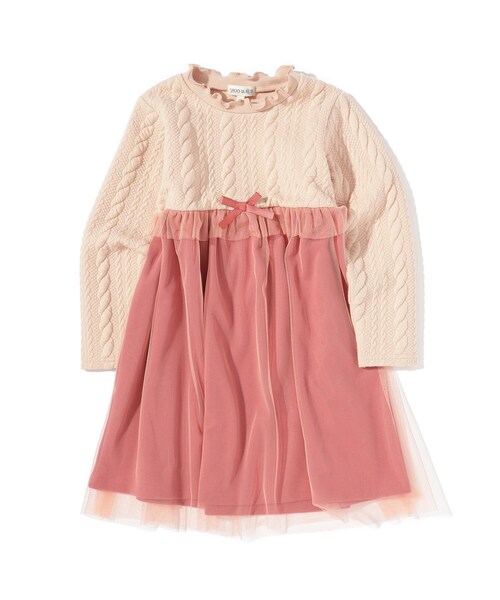 【デザイン】 冬のイベントにもおススメな、ケーブル柄のふくれジャガード素材を使ったドッキングワンピースです。 チュールスカートとコーディネートしたような1枚着デザインは、ちょっとおめかししたい日にもぴったり♪ 大人っぽいモノトーン配色と、ガーリーなピンクグラデーションの2色展開です。 姉妹リンクも可愛いですね。 ※ポケットなし 【生地感】 ふくれジャガード生地は、もっちりした柔らかな質感で、暖かな着心地です。 ※裏地なし 店舗へのお問い合わせ商品番号:122-53042 ●製品寸法: 10(100cm):着丈57cm B58cm 袖丈34cm 肩幅24cm W58~62cm H80cm 11(110cm):着丈63cm B62cm 袖丈38cm 肩幅26cm W62~66cm H84cm 12(120cm):着丈68cm B66cm 袖丈42cm 肩幅28cm W66~70cm H88cm 13(130cm):着丈73cm B70cm 袖丈46cm 肩幅30cm W70~74cm H92cm 14(140cm):着丈78cm B74cm 袖丈49cm 肩幅32cm W74~78cm H96cm 備考: