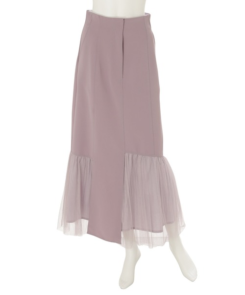 アシンメトリーの切替デザインと、裾のチュールプリーツがポイントのスカート。 カジュアルな素材にアクセントにの効いた切り替えステッチや、 女性らしいマーメイドのシルエットなど甘辛テイストがバランスよくミックスされています。 チュールは細かめの消しプリーツ加工で裾はふわっと広がりを残し、モードにならないよう計算しつくした一枚。 ハイウエストに立ち上げたウエストはスタイルアップ効果抜群です。 ▼スタイリング ニットやTシャツなど合わせによって印象の変わる一枚です。 足元もブーツからスニーカー・サンダルまでぴったりなので、 季節を問わずスタイリングが楽しめるのも嬉しいポイント◎