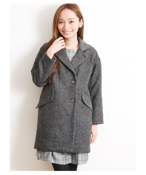 チェスターコート。縦糸・横糸の色目が配色になっていて、高級感のあるウール混の素材。上衿・ポケット口布部分にハリスツイード生地を使用した配色がポイント。大人めコーディネートにお勧め。【モデル身長:約169cm/着用サイズ:Mサイズ】