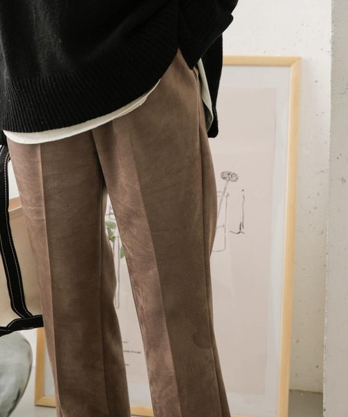 裾にかけて広がるフレアシルエットが脚長効果のあるイージーパンツを、ソフトスエード生地でご用意しました。ビロードのような質感の生地は上品見えし、コーディネートに取り入れるだけで全体のセンスアップに。更にストレッチ性を持たせているためリラックスした穿き心地を提供してくれます。細身のシルエットに入ったセンタープレスがより足のラインを綺麗に演出してくれるので、メインとしてはもちろん、チュニックやワンピースなどの重ね着にも重宝します。2サイズ展開なので体に合ったものをお選びいただけます。※商品画像は、光の当たり具合やパソコンなどの閲覧環境により、実際の色味と異なって見える場合がございます。予めご了承ください。※商品の色味の目安は、商品単体の画像をご参照ください。▼お気に入り登録のおすすめ▼お気に入り登録商品は、マイページにて現在の価格情報や在庫状況の確認が可能です。お買い物リストの管理に是非ご利用下さい。-----------------------------透け感:なし伸縮性:ややあり裏地:なし光沢:ややありポケット:あり-----------------------------
