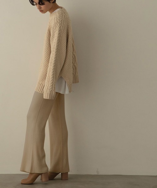 リブ素材のニットパンツ。ウエストもレングス部分も全て伸縮性があってリラックス感のある履き心地。ニットパンツは難しいとか着膨れする、脚が太く見える、、など気になる方には特におすすめ。シンプルなので合わせやすく、ニットトップスと合わせた同素材コーデも意外と簡単に気張った感じなくおしゃれに。薄手の素材なので着膨れせず少し落ち感があって縦に伸びたリブ編みの凹凸ですらっと縦長効果で脚を長く細く、着痩せして見せてくれますよ!ロング丈のトップスやシャツ、膝より少し下の丈のワンピースなどを合わせるのがおすすめ。お腹周りも隠せるし、そうすることで逆に洗練された大人の落ち着いた印象にしてくれます。スニーカーなどでカジュアル系に落とし込んだり、ブーツやローファーで綺麗めにまとめると全く違った印象にしてくれます。薄手なので秋~春先まで。春になったらサンダルと合わせても可愛いですよ! ※OFFWHITE透け感あり 伸縮性あり ※ポケットなし