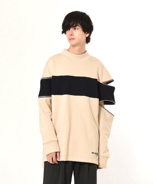 ライン切り替えのモックネックスウェット。袖のジップがアクセントに。 A,ベージュ × ネイビー B,ミント × ブラック C,ブラック × ブラック