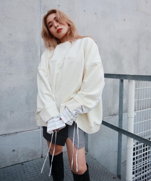 スウェット×シャツの異素材ドッキングがユニークなプルオーバー。 ストライプ柄のシャツ部分にはドロストリボンを配しており、絞ることでクシュクシュとしたこなれ感のあるスタイリングも楽しめます。 フロントには同色糸のロゴ刺繍をオン。ゆったりとしたオーバーシルエットで気負いなくスタイリングでき、女子に嬉しい華奢見せ効果も発揮してくれます。 スタイルのマンネリ化の打破にも一役買ってくれそうなアイテムです。