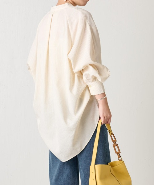 シャドウストライプの合繊生地を使用したノーカラーシャツ。袖口のタックのボリューム感、背中のワンタック、後ろ裾脇に取ったタックが立体的なシャツです。薄手のやわらかな素材で、合繊の為、しわになりにくくお手入れもしやすいです。ホワイトはホワイトのストライプを織りで表現。ピンクはアイボリー×ベビーピンクの優しい配色のストライプの予定です。・肩や二の腕が気になる方にオススメ・お腹周りが気になる方にオススメ【スタッフコメント】DAZAI青山166cm【blouse】着用サイズ:F透け感があり、生地に落ち感があるので女性らしく着られるブラウス。さりげなく入るストライプが単調に見えず、お袖とサイドに入るタックがワンポイントになります。伸縮性:なし透け感:あり裏地 :なし光沢感:なし《商品画像について》ご覧頂いている商品の写真につきましては、できるだけ実物の色に近くなるように努めておりますが お使いの環境(モニター、ブラウザ等)の違いにより、色の見え方が実物と若干異なる場合がございます。 予めご了承ください。 《予約商品について》・こちらの商品はサンプルでの撮影・計測となっております。実際の商品とは、商品の一部仕様が変更になる場合がございます。・サンプルの為、混率の詳細が確定しておりません。確定次第、記載いたします。・工場の生産の都合上、納期が変更になる場合がございます。発送日の前後についてはあらかじめご了承ください。・入荷状況により、お客様への発送が店頭販売より遅れる場合もございます。《ハートをタップして商品のお気に入り登録》登録カラーの商品の「残りわずか」「再入荷」「値下げ」通知を受け取ることができます。