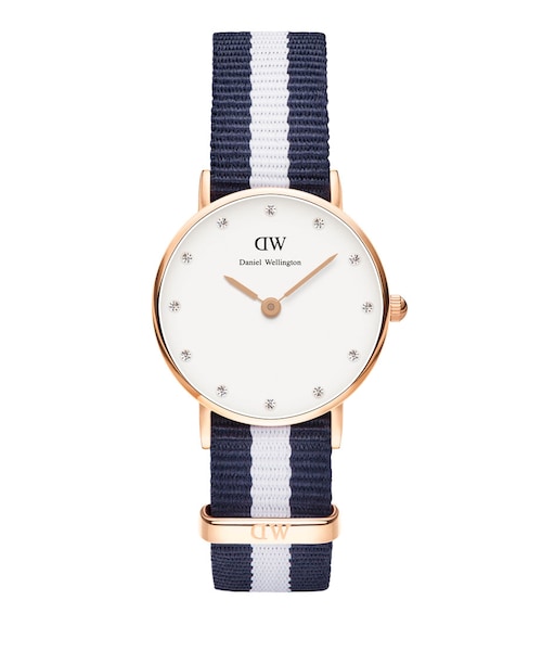 Navy Blue/White Classy Glasgow Rose Gold Watch by Daniel Wellington features striped strap design with Swarovski index stones. This classy watch is the perfect finishing touch to any ensemble.Face width x Face height x Strap length- 26 mm x 26 mm x 227 mm - 2 years limited warranty - Nato nylon strap - Stainless steel case- Notches display detail- Japanese quartz movement- 3 ATM water resistant- Pin buckle fastening- Analogue