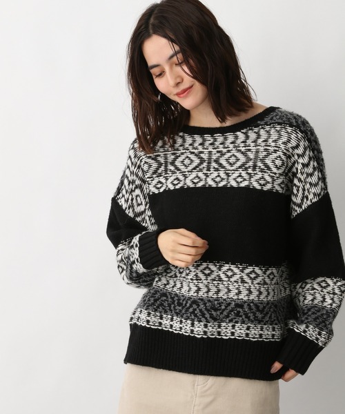 印象的なガラがポイントのニット 【機能】 マシーンウォッシャブル:洗濯機で洗える ジャガード柄を様々な糸で編み込んだ立体感のある表情ニット。着丈が少し短めなので、レイヤードして今年らしい雰囲気も楽しめます。カラーは、落ち着いたトーンなので、柄物が苦手な方にもおすすめ。
