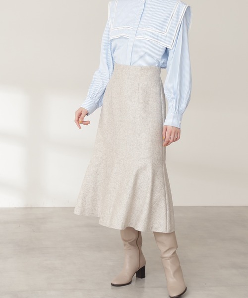 ウォームタッチで暖かみを感じられるマーメイドスカート。ウエストベルト周りの装飾をなくしてすっきり仕上げています。裾に向かう途中で切り替えを入れてフレアの分量をだすことでマーメイドラインが引き立ちます。トップスのデザインによって、インにもアウトにも着回しできる便利な一枚です。