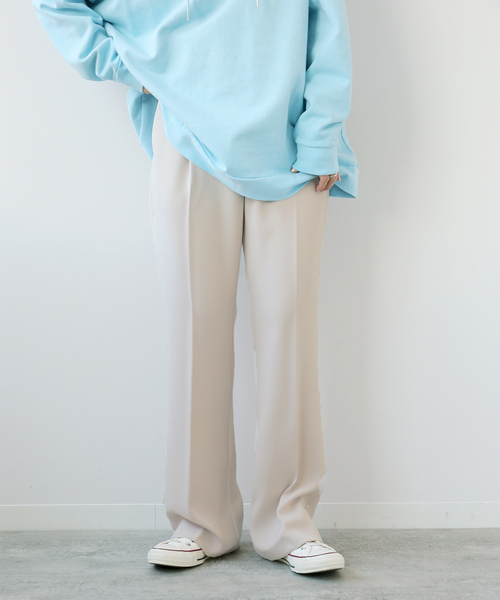 【2021AW】B.C STOCK毎シーズン人気の高いオケージョンアイテムが登場!幅広いTPOで活躍する梨地のストレートパンツです。通勤などのオンシーンではもちろん、カジュアルなスウェットやTシャツに合わせてもトレンド感のあるバランスに◎ウエストの背中側にはゴム入りで、程良くフィットする着心地。一枚あればデイリーに活躍すること間違いなしの万能パンツ。トップスのセレクト次第で、オケージョンからきれいめカジュアルまで、幅広いTPOで活躍します。単品ではもちろん、同素材のジャケットとのセットアップでもお楽しみいただけます◎●シリーズ商品梨地ジャケット(品番:21010700501040)**********************透け感:ややあり(ベージュのみ)裏地:なし伸縮性:なし光沢感:なし生地の厚さ:普通**********************【スタッフ着用コメント】 《スタッフ staff.s》 身長:165cm/普段サイズ:S~M/着用サイズ:38サイズサイズ感:ウエストの後ろのみゴムの仕様になっておりサイズ感はちょうど良かったです。腰幅があるのですが、タックがあるので腰にシワが寄ることもなく、きれいなシルエットで着用が出来ました♪着丈は足の甲に付くくらいでした。 素材感:表面に凹凸感があり様々なTPOに対応できる梨地素材◎通勤でもデイリーにも使える軽い素材感です。着心地:裏地無しの軽やかな着心地でオンシーン・オフシーン問わずデイリーに活躍しそうな一枚です。 **********************【スタッフ着用コメント】《スタッフasako》年齢:30代前半/身長:153cm/体型:普通/普段サイズ: S~M/着用サイズ :38サイズ感: 38サイズを着用し、ウエストはちょうど良かったですが丈は少し長めでした。ヒールのある靴を選ぶか、私の身長では36サイズが良さそうでした◎素材感: 素材は、梨の皮のような繊細な凸凹があり、生地が肌に張り付きにくく着心地の良い生地感でした!裏地無しですが、ブラック・ネイビーは透けず、ベージュは薄めのカラーなので、少し透けが気になりました。ベージュのみ、インナーを気を付ける必要がありそうです。着心地:動きやすく、屈伸もしやすかったです。軽い素材なので、オールシーズンに対応できるのも◎**********************※取り扱いについては、商品についている品質表示でご確認ください。※店頭・屋外での撮影画像は、光の当たり具合で色味が違って見える場合があります。商品の色味は、スタジオ撮影の画像をご参照ください。モデルサイズ:H165 着用サイズ:38本体:ドライクリーニング、色あせ