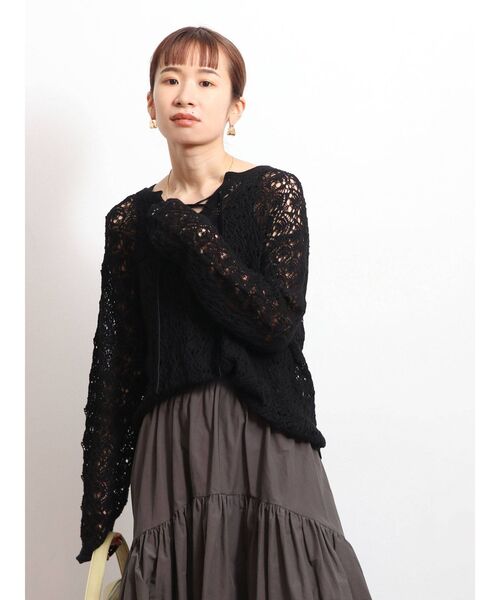 透かし柄と首元のレースアップがヘルシーで可愛いニット ■デザイン 程よくルーズなサイズ感と抜け感が出る首元がポイントです。 ■サイズ感 腰回りが隠れる着丈です。 ■スタイリング ブルーデニムなどのカジュアルパンツがヘルシーでオススメです。 ・・・・・・・・・・・・・・・・・・・・・・ 透け感:あり 裏地:なし 伸縮性:あり 光沢感:なし 生地の厚さ:普通 ・・・・・・・・・・・・・・・・・・・・・・ ※画像の商品は参考商品です。 実際の商品と仕様や加工、サイズが若干異なる場合がございます。 サイズ表も合わせてご確認ください。