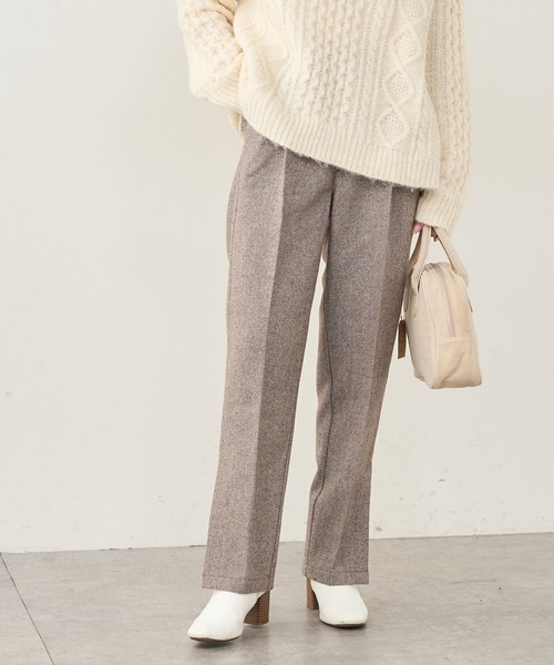 ピュアルセシン 2021 autumn&winter collection【sophisticated retro】 ◇トレンドライクな着こなしになるセンタープレスパンツ◇ ●デザイン ヘリンボーン柄がアーバンな印象のストレートパンツは、センタープレスが効いていて美脚効果抜群。 6分丈程の裏地が付いているのでストレスフリーな穿き心地です。 ウエストは後ろのみゴムになっているのでインスタイルもスッキリ着こなすことができます。 デイリーはもちろん、ちょっとしたパーティーシーンなど シーンを問わず表情豊かなスタイリングで着まわせる1枚です。 ●カラー展開 ブラウン系とグレー系のデイリーに使いやすいカラーラインナップです。 ●素材 ウール混で仕立てたシーズンライクな素材感です。 ●スタイリング ブラウスやシャツなどキレイめアイテムから Tシャツやロゴスウェットなどカジュアルなアイテムまで幅広く対応します。 足元はバレエシューズやローファーの他に、女性らしいショートブーツもおすすめです。 =============================== 透け感:なし 裏地:あり 伸縮性:なし 光沢感:なし 生地の厚さ:やや厚手 【スタッフコメント】 年齢:20代前半/身長:152cm/普段着用サイズ:Mサイズ サイズ感:152cmでバレエシューズを履いていても引きずらないパンツ丈です。 素材感:暖かみのある起毛感があります。裏地が膝まであるのでストレスなく穿けました。 =============================== ※撮影場所やお使いのモニター環境により若干お色味が異なる場合がございます。特にロケの撮影では明るく見える傾向にございます。 ※予約商品はサンプルで撮影をしております。若干の仕様が変更になる場合がございますので予めご了承の上ご注文くださいますようお願いいたします 。