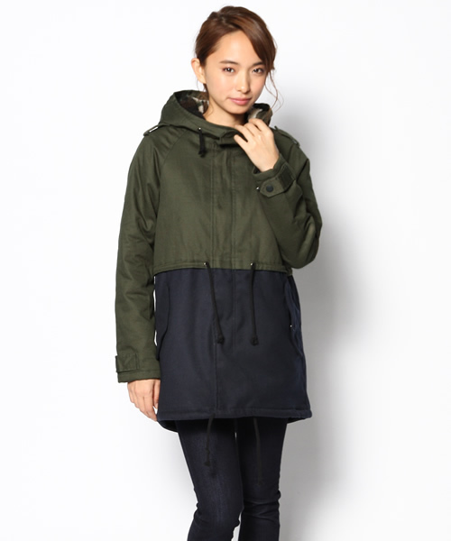 シルエットのキレイなモッズコートは 異素材&バイカラー でワンランクアップ。合わせやすいカラーリングなのもウレシイですね! 内側 はトレンドのカモフラ柄のボアでとってもあったか☆