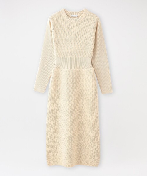 表情のある矢柄編みとリブコンビのニットドレス。 【素材】 ソフトな肌触りが特徴のバルキー感と温かみのあるアクリル糸を使用。 【シルエット/デザイン】 表情豊かな矢柄にリブ素材を合わせた、コンビネーションニットドレス。 シルエットにメリハリが生まれ、自然とスタイルアップが叶います。 ニットならではの着心地の良さと、デザイン性を兼ね備えた一着です。 【スタイリング/その他】 1枚でコーディネートが完結し、楽ちんさがありながらも、お出かけ着にぴったりな存在感のあるドレスです。