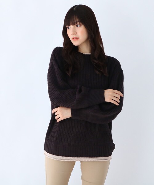 ■デザイン 襟と裾が重ね着風になったデザインのニットです。 襟と裾部分は配色仕様になっているのもポイントです。 ほどよいゆったりとしたシルエットが、今年らしい雰囲気で着こなして頂けます。 袖口のボリュームデザインも可愛いです。 ■生地感 ふんわりと厚みがあり、軽い着心地のアクリルニットです。 ■スタッフ着用コメント 配色とぽわんとしたシルエットが今年らしいデザイン。 お尻も隠れる丈感なので、ゆったりと着ていただけます◎ そしてプチプラなのがとってもうれしいですね! ■スタイリング ベーシックにパンツ合わせでも良し、スカート合わせでフェミニンにしても良し◎ タバコブラウン、ラズベリーピンクは秋冬、 サンドベージュは春を先取り、ブラックはオールマイティに。 なイメージです。 こちらの商品は主に冬に着用いただける商品です。 モデル情報:身長168cm B75 W60 H87 着用サイズ:02(M) 店舗へのお問い合わせ商品番号:741-13005 ●製品寸法: 02(M):着丈59cm B120cm 袖丈49cm 肩幅51cm 03(L):着丈59cm B124cm 袖丈51cm 肩幅53cm 備考: