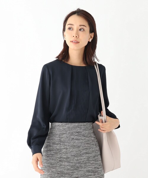 OPAQUE.CLIP NAVYフランスの素材メーカー、DELEGANT(デレガント)社のファブリックを使用したブラウス。サテン素材を裏使いし、サテンの質感はそのままに、シーンを選ばず上品に着用していただけるアイテムに。フロント部分にはプリーツをあしらい、パンツやスカートにインしても華やかなデザインです。この商品の表地はフランスで企画し、中国で製造された生地を使用しています。マシンウォッシャブルでお手入れが簡単なのも嬉しいポイントです。※こちらの商品はやや透け感があるため、インナーの着用をおすすめします。こちらの商品は主に春に着用いただける商品です。モデル情報:身長165cm B81 W59 H84 着用サイズ:38(M)店舗へのお問い合わせ商品番号:637-84001●製品寸法:34(SS):着丈57cm B107cm 袖丈56cm 肩幅37cm36(S):着丈57cm B110cm 袖丈57cm 肩幅38cm38(M):着丈58cm B113cm 袖丈58cm 肩幅39cm40(L):着丈60cm B116cm 袖丈59cm 肩幅40cm42(LL):着丈60cm B119cm 袖丈60cm 肩幅41cm備考: