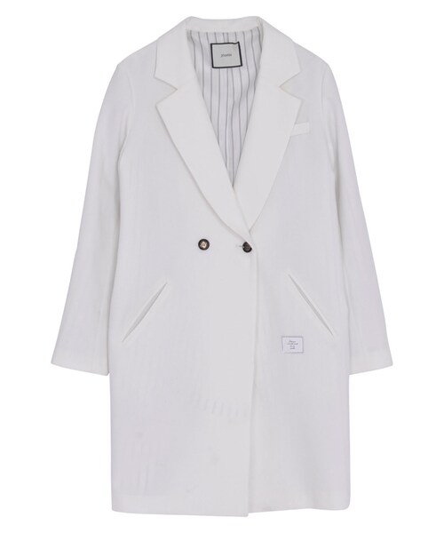 秋冬トレンドのロング丈ジャケット。スリムなダブルボタンデザインなのでパンツスタイルもワンピスタイルも細見えします。※画像はサンプルでの撮影の為実際の製品とは若干異なります。左ポケット下にサンプル画像のような長方形のシンプルなパッチのデザインが入ります。
