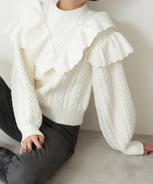 様々なミックス編みとフリルディテールを組み合わせたレディライクなニット。肩まわりと前後のV字切り替えでフリルトリミングを施したデザインがポイント。 冬のニットスタイルをより華やかに、大人な雰囲気に見せてくれる一枚です。 ボトム合わせによってカジュアルにもフェミニンな雰囲気のコーディネートを楽しめます。
