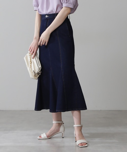 大人のカジュアルスタイルにぴったりなマーメイドデニムスカート。裾に三角マチの切り替えを入れて分量をだしたマーメイドシルエットがポイントです。コンパクトなトップス、ゆるニット、ブラウスやTシャツなどと、長いシーズンで着用できるのも魅力です。