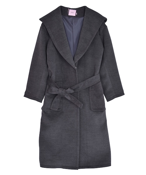 大きなショールカラーがそのままフードになっているコートです。今季トレンドのロング丈でガウンのようなデザインになっているのでパンツスタイルにもガーリーなスカートスタイルにもさらりと羽織れます。特にデニムやTシャツとのカジュアルなスタイリングがおすすめです。
