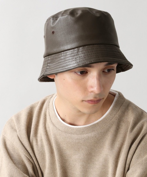 ーーー フェイクレザーを使用したバケットハット。 オールシーズンで着用していただけるレザータッチのアイテムは、様々なコーディネートと相性抜群。 無骨な雰囲気を纏いながらも高級感もあり、スタイリングの格をグッと上げてくれるアイテムです。 内紐付きで、頭周りのサイズ調整可能なのも嬉しいポイント。 ユニセックスとして女性の方にもおススメです。 ーーー キレイめなスタイリングは勿論、古着ミックスのカジュアルスタイリングとも相性抜群です。 レトロでヴィンテージ感のある雰囲気がコーディネートのアクセントとして◎