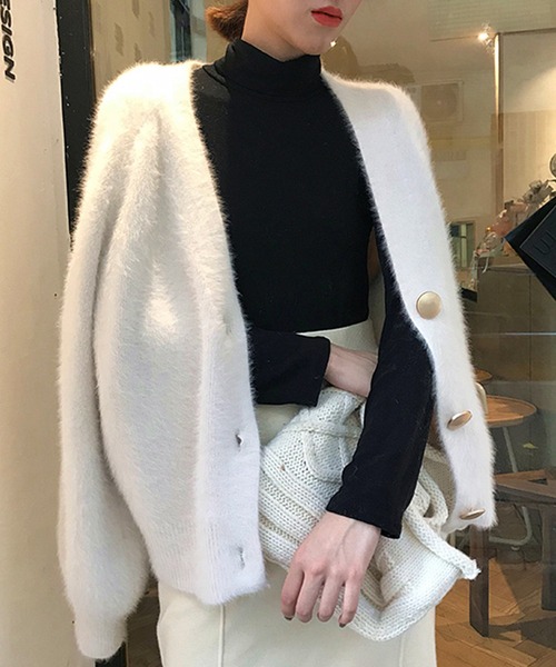 ふわふわニット素材で女の子らしくきまるVネックカーデ☆ 大きいゴールドボタンがとっても可愛く、 カジュアルから大人フェミニンまで着こなせる万能アイテム。 スカートは勿論、スキニーコーデにも相性抜群で コーデの幅が広がります♪