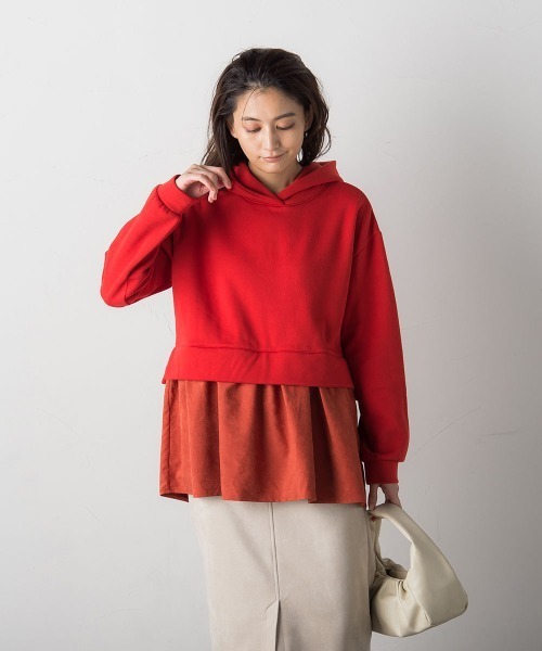 プレイフルなカラーリングと異素材ティアードがポイントのフーディ。 異素材部分は身生地と同系色で大人な印象に仕上げました。 スタイルアップする切り替え位置とヒップが隠れる丈感、程よくルーズなサイジングに仕上げています。 甘いティアードと、ややルーズなシルエットにはタイトスカートでメリハリを。 【素材の特徴】 程よく肉感があり柔らかい、裏起毛素材。 ティアード部分は温みあるスウェードライクな合繊素材。 ---------------------------------- 洗濯方法 家庭洗濯:液温は30℃を限度とし、洗濯機で非常に弱い洗濯ができる。 自然乾燥:日蔭の吊り干しがよい。 アイロン:底面温度150℃を限度としてアイロン仕上げができる。 ドライクリーニング:ドライクリーニング禁止。 ---------------------------------- ■モデル身長 165cm/着用サイズ M ※画像の商品はサンプルとなりますので実際の商品と仕様、加工、サイズが若干異なる場合がございます。 ※お客様のモニター環境により実際のお色と多少異なる場合がございます。 ※撮影状況や光の当たり具合により、色合いが異なって見える場合がございます。 【socolla】 Just the way she is... 特別なサプライズがなくても、遠くへ旅行しなくても いつでも日常の中の素敵なシーンで輝けるようにリラックス感を保ちつつ、 けっしてラフ過ぎない 「今どき感」「女性らしさ」のあるワンマイルウェアを展開。 「飾りすぎない自分らしいスタイル」を好むナチュラルな女性たちへ送る、socolla スタイル。
