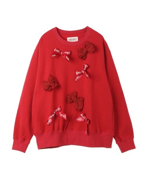 ロゴ入りサテンリボンとローンで作ったリボンをフロントに交互にいっぱい取り付けたキュートで華やかなトレーナー。”ロージーローズプリント”のリボンのイメージから作られたリボンはとってもキュート!オーソドックスなスウェット地を使用しているので重ね着もしやすくとっても便利”!カジュアルすぎず可愛く着られるところもポイントです!