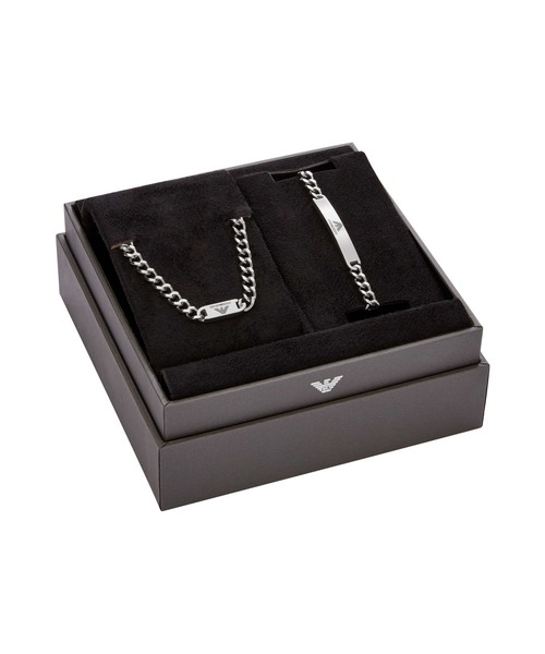 Emporio Armaniのシルバートーン ステンレススチール製ネックレス&ブレスレットのセットです。ロブスタークラスプ付き。※ご覧のモニター環境、照明等により実際の商品と色味が異なってみえる場合がございます。