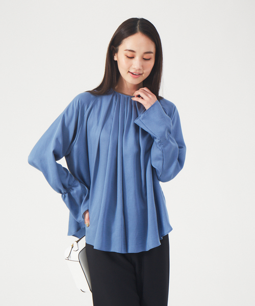 *Detail*程よく光沢のある素材でほんのりヴィンテージ感のあるブラウス。襟元にタックを施し、綺麗にドレープがでるように仕上げました。上品なとろみ感を残しつつ、硬すぎない表面感のある生地が特徴。程よく肌離れしてくれるシルエットでボディラインを拾わないのもうれしいポイント。*Coordinate*ふんわりと広がるシルエットで細身のパンツやテーパードパンツと好相性。上品な印象で通勤シーンにもおすすめ。スリーブも太すぎず、ジャケットをONしやすいデザインです。ホワイト モデル:H171 B80 W58 H86 着用サイズ:Fブルー モデル:H171 B80 W58 H86 着用サイズ:F