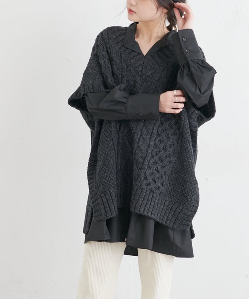ピュアルセシン 2021 autumn&winter collection【sophisticated retro】 ◇あたたかみのある、Vネックケーブルベスト◇ ●デザイン 深いVネックのニットベスト。 前後にケーブル編みが贅沢に施されており、 コーディネートに華やかさを加えてくれます。 オーバーサイズなので幅広いスタイリングが可能です。 脇にスリットが入っており、 重ね着した時にスッキリとした印象になります。 ●カラー展開 アイボリー/モカ/スミクロの3色展開。 ナチュラルな色合いで、コーディネートに取り入れやすいカラーリングです。 ●素材 ウール100%。 天然素材ならではの暖かみのある素材感。 やや太めの糸でざっくり編まれています。 ●スタイリング 今年らしいレイヤードスタイルが楽しめます。 シャツやブラウス、ワンピースを合わせてトラッドに。 長袖カットソーを重ねてカジュアルに。 ボトムスはテーパードパンツやストレートのワイドパンツ、 プリーツスカートなど、幅広いアイテムと好相性です。 真冬はアウターと合わせたコーディネートも楽しめます。 ============================ 透け感:なし 裏地:なし 伸縮性:ややあり 光沢感:なし 生地の厚さ:厚手 【スタッフコメント】 年齢:30代前半/身長:156cm/普段着用サイズ:Lサイズ サイズ感:身体が泳ぐサイズ感。チュニック丈で、スタイルカバーが出来そうです。 素材感:ウール100%で、とても暖かいです。 それほど重さは感じませんでした。 =============================== ※撮影場所やお使いのモニター環境により若干お色味が異なる場合がございます。特にロケの撮影では明るく見える傾向にございます。 ※予約商品はサンプルで撮影をしております。若干の仕様が変更になる場合がございますので予めご了承の上ご注文くださいますようお願いいたします 。