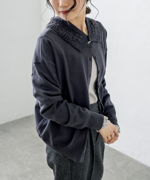 ピュアルセシン 2021 autumn&winter collection【sophisticated retro】 ◇前後、襟ありなしと4パターンで楽しめるニット◇ ●デザイン シンプルなクルーネックのニットに ニットと同じ糸で編まれてた襟がセットになったマルチウェイニットです。 前後の首開きは同じ大きさなので、カーディガンとしてもプルオーバーとしても着用が可能。 着丈はスッキリと腰丈。 上品な印象になる少し光沢のある糸を使用しているので、ONの日も取り入れていただけます。 厚すぎない生地感でアウターの中でも嵩張らず、 ダウンなどのボリュームのあるアウターの中にもオススメです。 取り外し可能な透かし編みの襟はナチュラルなかわいさ。 お手持ちのブラウスやカットソーなどに襟だけ合わせても楽しめます。 ●カラー展開 どの色も杢の風合いが綺麗です。 ナチュラルな、キナリ、グレージュの他に、 キレイな色味のブルーグレー、 大人な雰囲気のチャコール、 の4色です。 ●素材 もちもちと弾力のある質感。 ほんのり光沢があり上品な雰囲気です。 ●スタイリング コンパクトなサイズ感のニットなので、スカートやワイドパンツなど、ボリュームのあるボトムスとの合わせがオススメです。 襟付きセーターとフレアスカートでシックに。 有り無しセーターとキレイ目パンツでお仕事コーデも。 ワンピースの上に、カーディガンで羽織でも活躍します。 ============================ 透け感:なし 裏地:なし 伸縮性:あり 光沢感:ややあり 生地の厚さ:普通 【スタッフコメント】 年齢:30代後半/身長:154cm/普段着用サイズ:Mサイズ サイズ感:スッキリとしたサイズ感。肩は少し落ちているので胸周りはゆとりがあり着やすいです。腕はスッキリとしているので、アウターを選ばず着られそうです。 素材感:とても伸びのいいニット。ちくちくせず心地よいので、室内にいる日はインナーを薄くしてもいいと思います。 =============================== ※撮影場所やお使いのモニター環境により若干お色味が異なる場合がございます。特にロケの撮影では明るく見える傾向にございます。 ※予約商品はサンプルで撮影をしております。若干の仕様が変更になる場合がございますので予めご了承の上ご注文くださいますようお願いいたします。