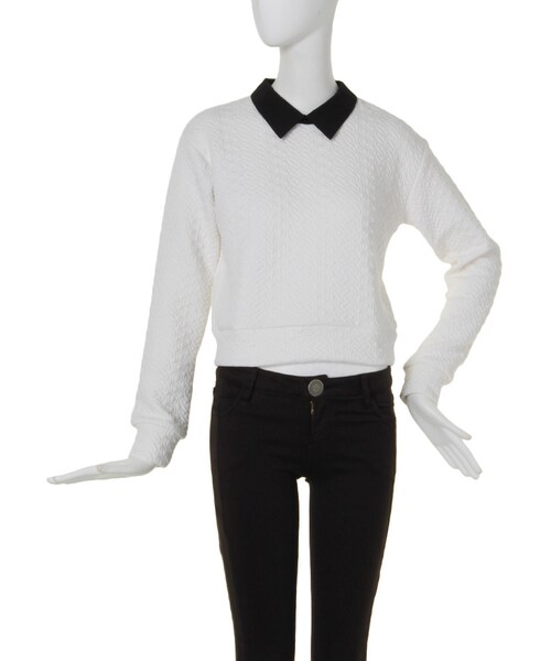 カットジャーカード×衿のみ綿ブロード素材。昨シーズンも好評だったカットジャーカードtops。合わせやすいコンパクトなサイズ感はそのままに今季はランダムチェーン柄×衿をブロード素材にし、きちんと感をプラスしました。コンパクトなサイズ感の為、フレアミニスカート・ミモレスカートやフレアショートパンツ等とのstylingがバランスが良く◎。