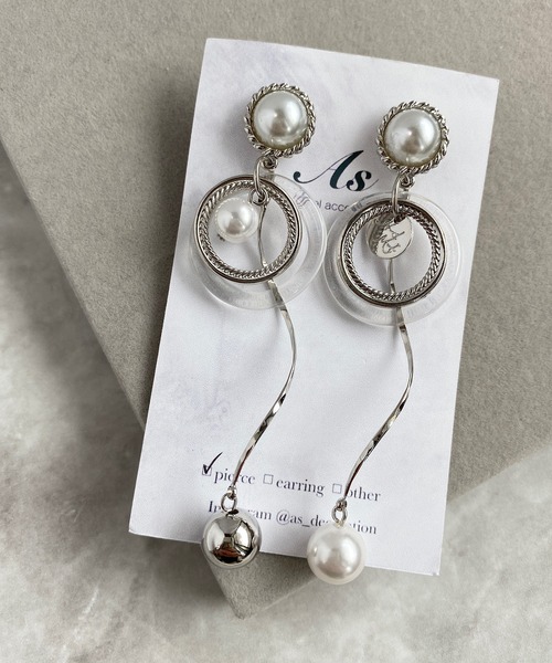 【As】大ぶりながら軽量で普段使いしやすい個性派アクセサリーを製作しています。 クリアなアクリルパーツや銅玉を使用しアシンメトリーなデザインに仕上げました。 ◎カラー展開 ゴールド、シルバー(各3デザイン) 〇ゴールド、シルバー 全長約9cm 〇ゴールド2、シルバー2 全長約9cm 〇ゴールド3、シルバー3 全長約8.5cm ◎アレルギー対応 サージカルステンレススタッド芯を使用しております。(症状には個人差がありますため、すべての方にアレルギーが出ないという意味合いではございません。) ◎ご購入にあたっての注意事項 〇メッキ加工の商品は経年劣化は避けられませんが、汗や雨など水分はこまめに拭って頂き、OPP袋等なるべく空気に触れずに保管していただくことで、長くきれいにご使用いただけます。 〇ハンドメイド商品のため、パーツに細かい傷などが見られる場合がございます。予めご了承の上、ご購入をお願いいたします。 〇繊細なパーツを多く組み合わせた商品ですので、お取り外しは優しく丁寧にお願いいたします。