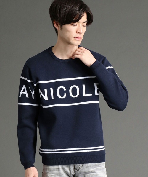 身頃と袖にブランドロゴをダブルジャカード編みで表現したニットになります。12Gの糸を使用し保温性に優れた厚みのあるニットに編み上げています。コットンベースのダブルジャカード編地のため、肌当たりが良くスウェット感覚でも着用頂けます。