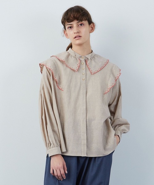 ザックリとしながらもサラッとした肌触りのストライプ素材をベースに「クロアチア」の伝統的な刺しゅうからインスピレーションを受けた柄を施したデザインブラウス。 ゆったりとしたオフショルダーにややAラインの身頃、ボリュームが有りながらも大き過ぎずふわっとした印象の袖はクラシックでは有りながらもスッキリとした雰囲気を作っています。 肩やビックカラーのパーツに部分的に施された繊細で配色の効いた刺しゅうが重過ぎず軽やかさをだしています。 タキシードカラーをモチーフにした衿まわりが顔まわりの印象をスッキリと見せてくれ、袖山に取ったタックが立体的でクラフト感を演出したりと細かなこだわりもポイントのブラウスです。 【ブランド情報】 FRAPBOIS/フラボア 2001年にブランドスタート。 「大人げない大人の服」をコンセプトに、大人が着るリラックスしたデイリーウェアを提案するコレクションブランド。 レディースとメンズのアイテムをご用意しています。 ---------------------------------------------------------------------- 【お気に入り登録】がおすすめです。 ■商品のお気に入り登録 再入荷、残り1点、セールなどの通知を受け取ることができます。 →商品ページ ♡ をクリック ■ショップのお気に入り登録 新商品や再入荷、セール、クーポン配布、ショップニュースなど、いち早くショップの情報を受け取ることができます。 →「♡お気に入りショップに追加」 をクリック ----------------------------------------------------------------------