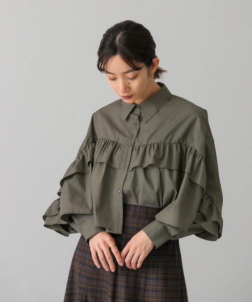 【袖と前身頃のラッフルフリルが女性らしいシャツ】袖と前身頃のラッフルフリル使いが女性らしさを演出。バックはタックショルダーを施すことで程良く立体感のあるシルエットに仕上げました。短すぎず長すぎない着丈は合わせるボトムを選ばずに着ていただけます。ワードローブに取り入れやすいベーシックカラーにも注目してみて。POINT・女性らしさを演出するラッフルフリル使い・ボトムを選ばない着丈・スタイリングに取り入れやすいベーシックカラーCOORDINATEボトムはシンプルにまとめるとトップスのデザインが活きるのでおすすめです。ダメージデニムや、レザースカートと合わせるとバランスの良いスタイリングが完成します。※商品画像は、光の当たり具合やパソコンなどの閲覧環境により、実際の色味と異なって見える場合がございます。予めご了承ください。※商品の色味の目安は、商品単体の画像をご参照ください。-----------------------------透け感 : ややあり(WHITEのみ)伸縮性 : なし裏地 : なし光沢 : ややありポケット : なし-----------------------------